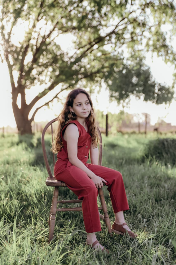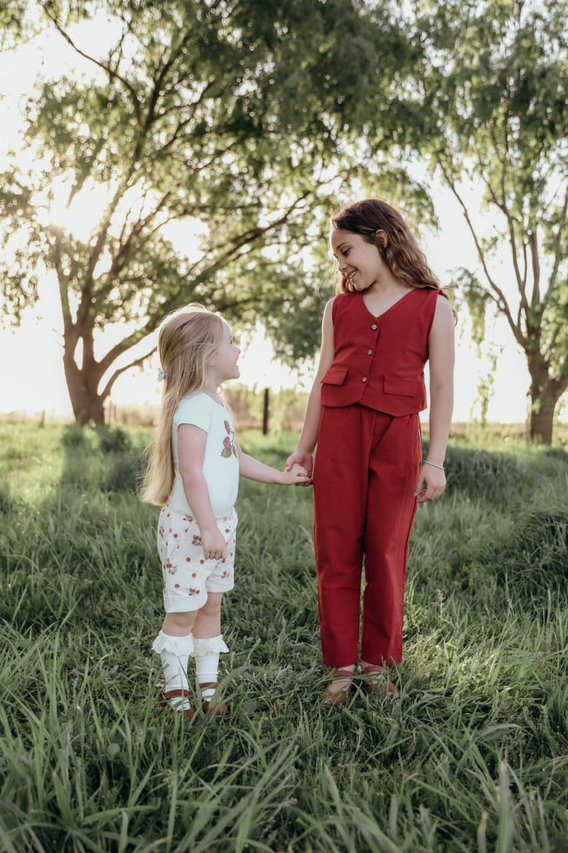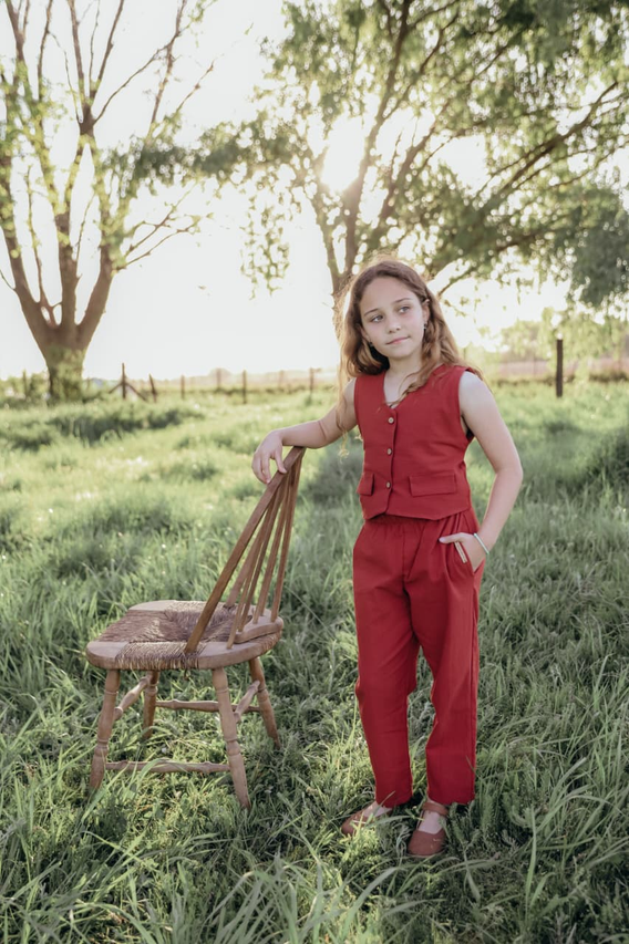 Pantalón de tusor rojo carmín con cintura alta elastizada.