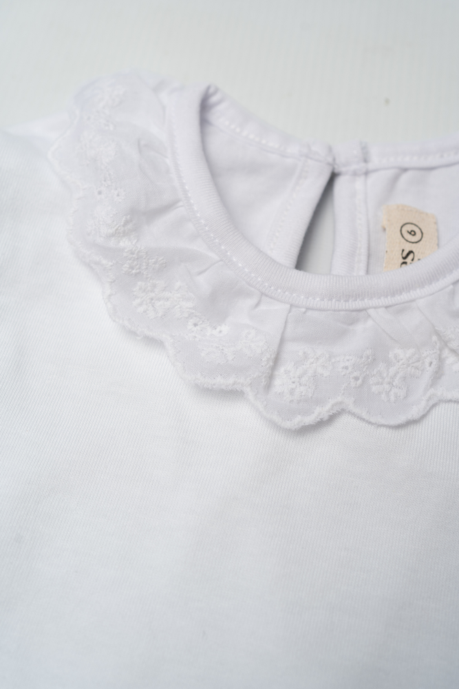 Remera básica de algodón blanco, con broderie aplicado en cuello