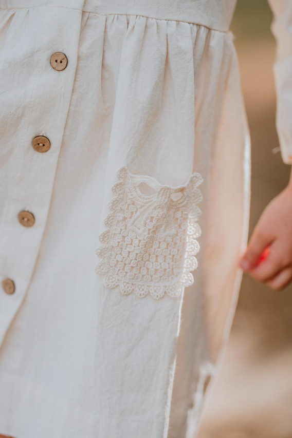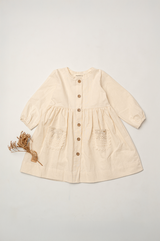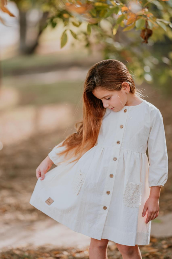 Vestido color crudo; con botones y bolsillos aplicados en el delantero.