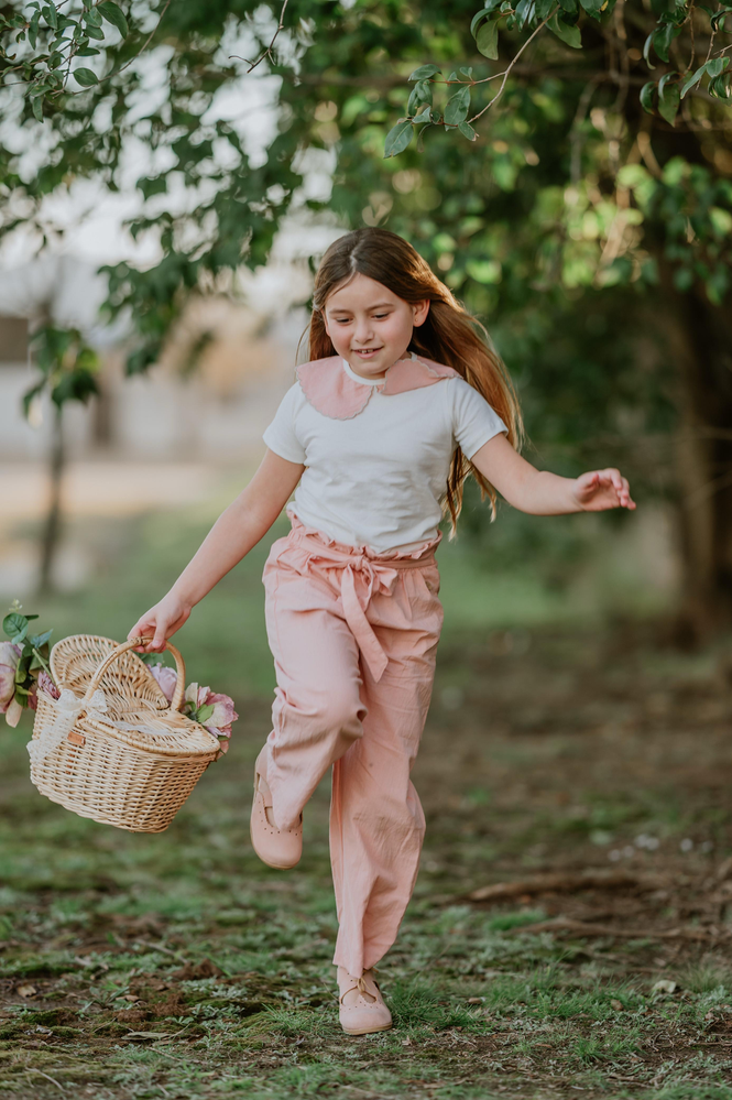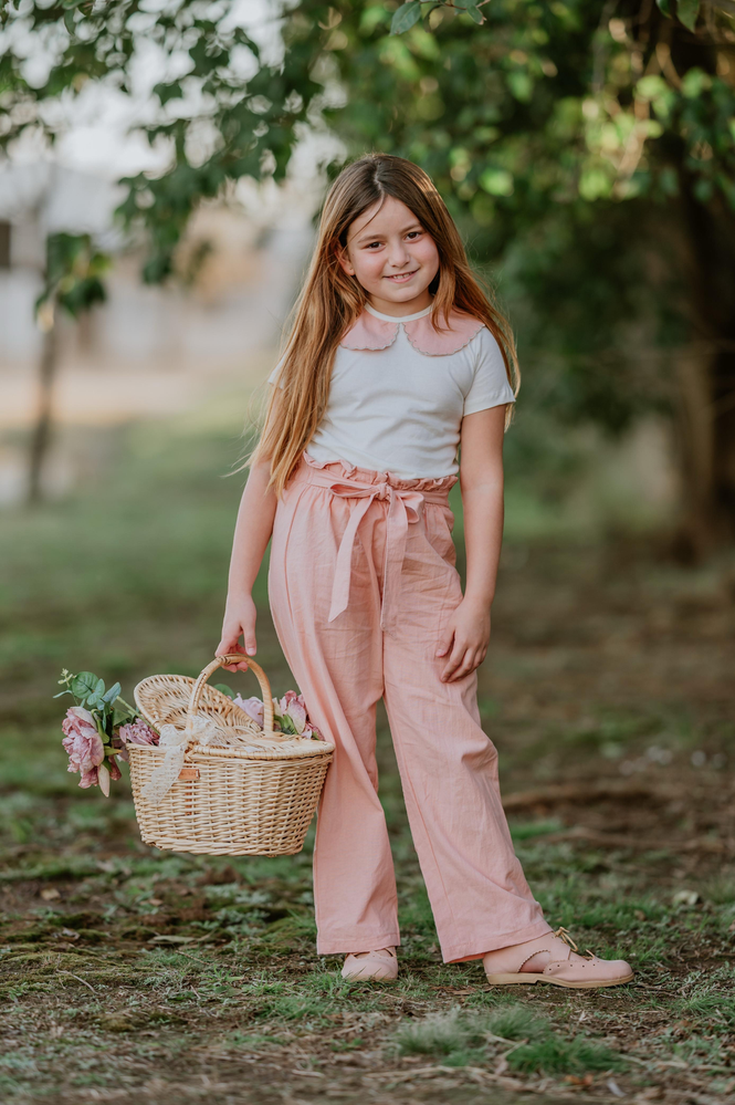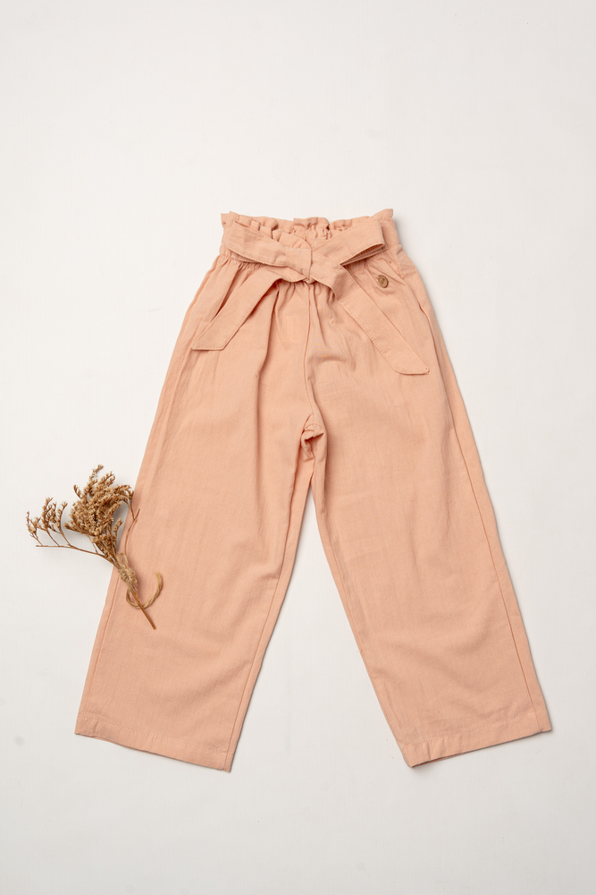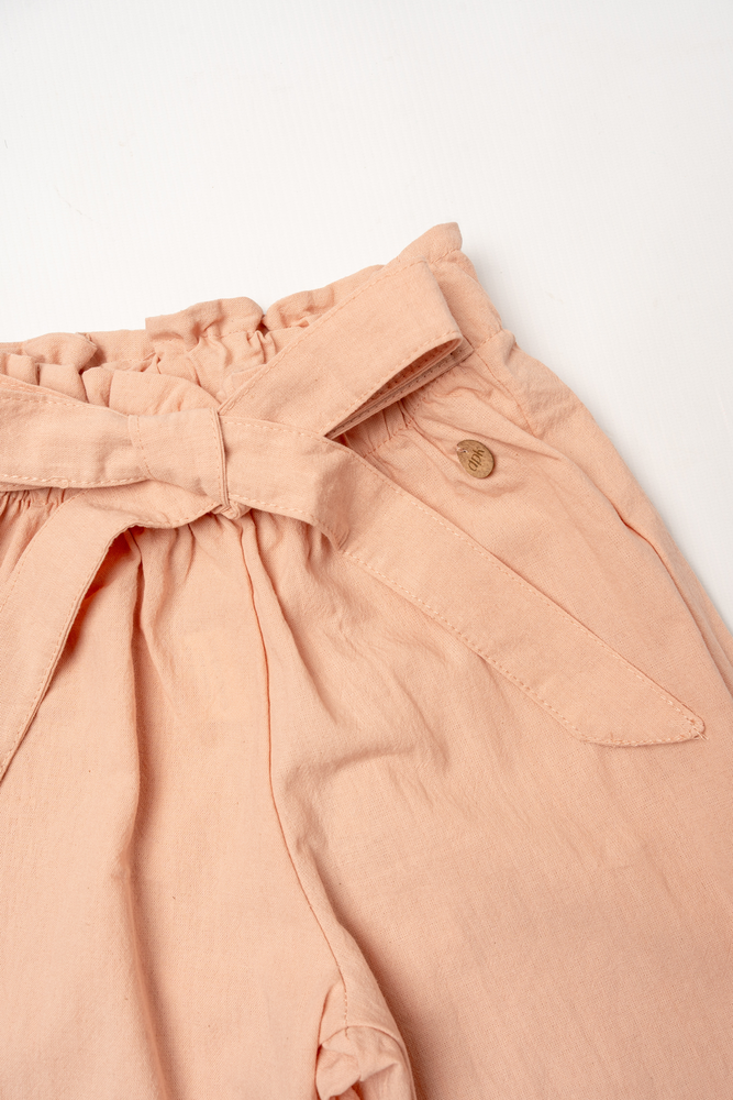Pantalon rosa con lazo en la cintura.