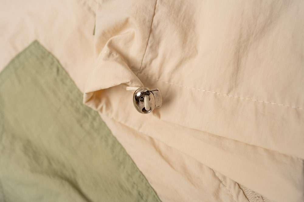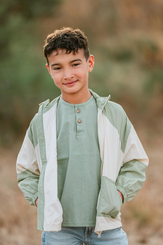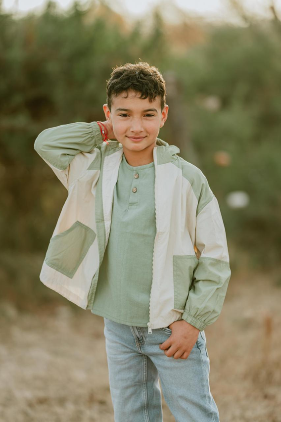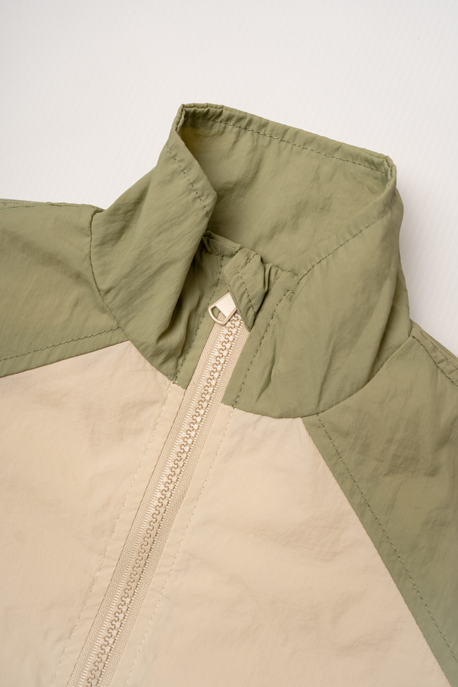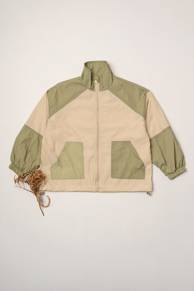 Campera rompeviento color verde combinada.