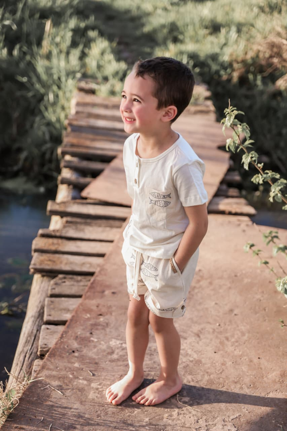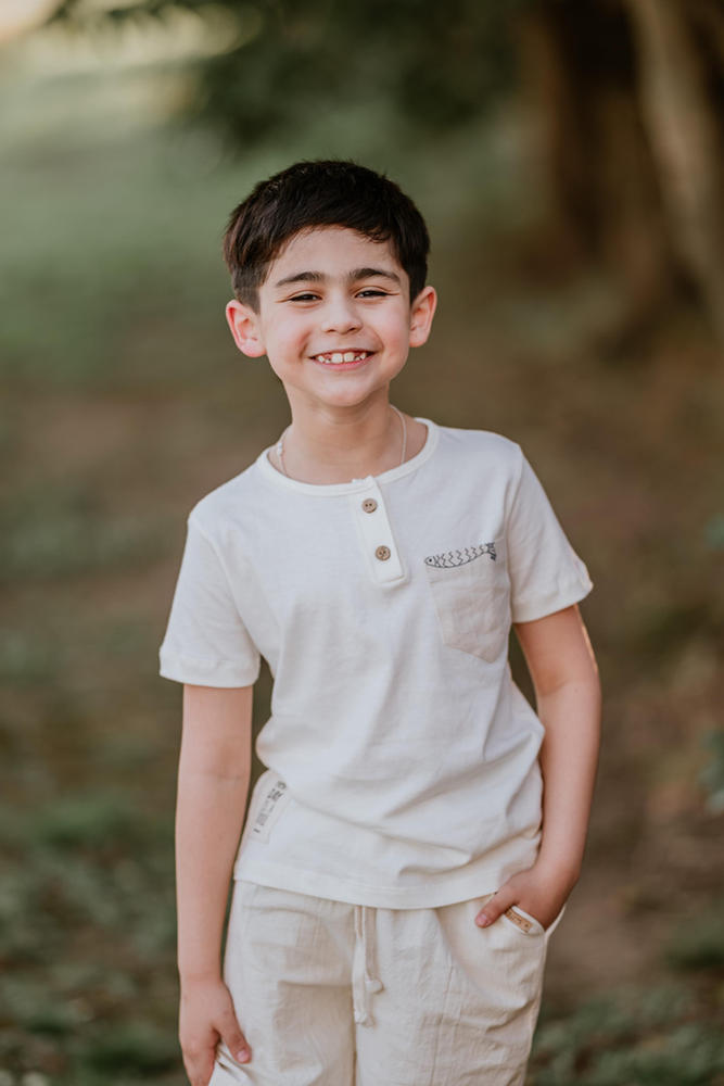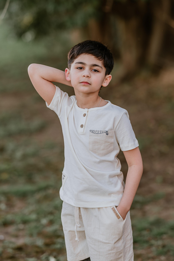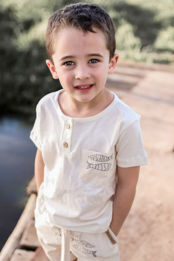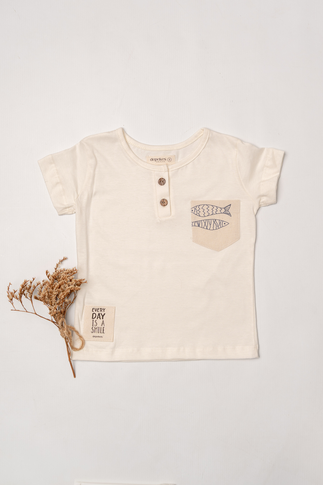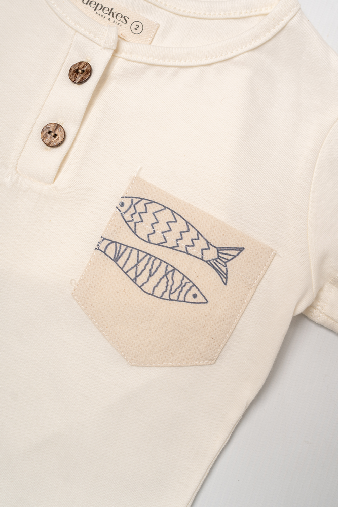Materiales: Confeccionado en algodón elastizado, con bolsillo aplicado de tusor estampado peces.