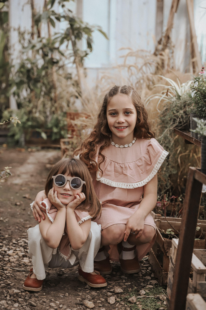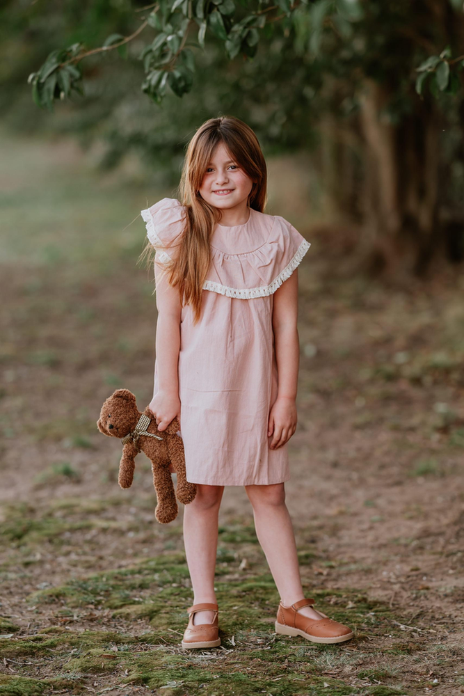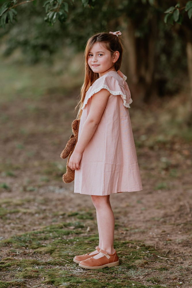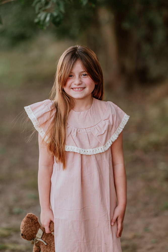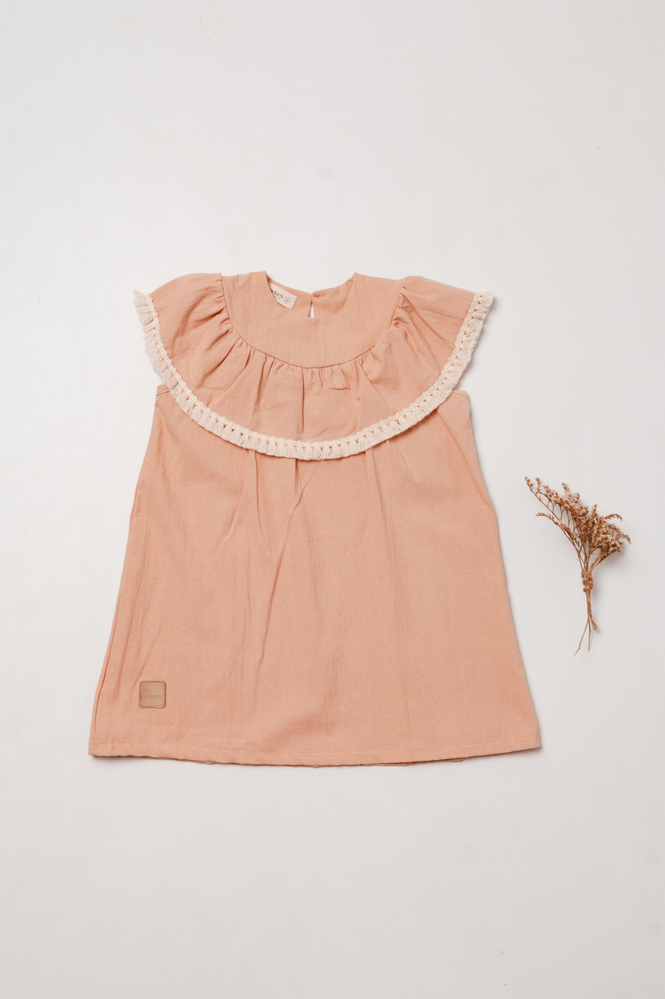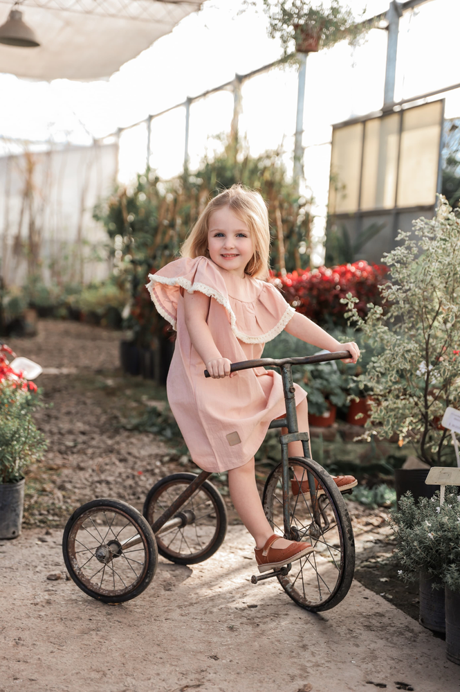 Vestido rosa viejo , con volado en el delantero con guipiur.