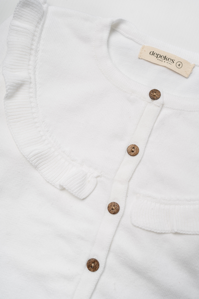 Un clásico renovado, confeccionado en algodón tejido 100%, ideal para acompañar los días frescos con estilo y comodidad. Su textura suave, el detalle de volado en el cuello y los botones de madera hacen de esta prenda una opción delicada, elegante y funcional para completar cualquier look. 🌿