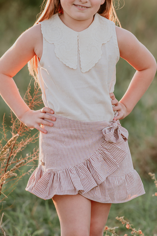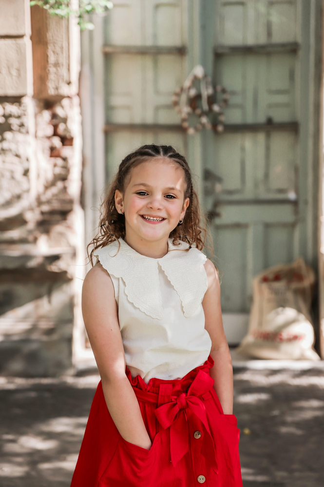 Lo que la hace especial 💫 Una blusa versátil que combina simplicidad y elegancia, ideal para acompañar faldas, shorts o pantalones. Un clásico de Depekes que realza la dulzura y frescura de la infancia. 🌸