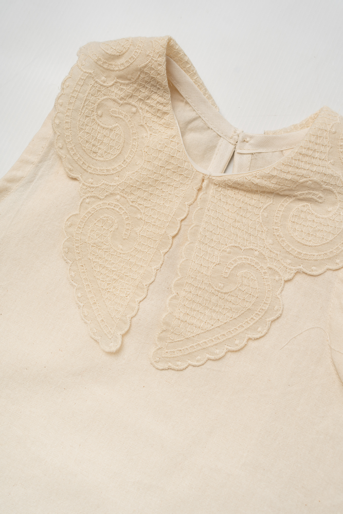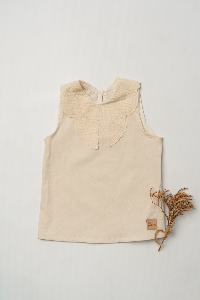 Tela: Algodón liviano, suave y respirable. Color: Crudo natural. Detalle distintivo: Cuello aplicado a tono con delicado bordado. Diseño: Sin mangas, con terminaciones limpias y calce cómodo. Confección: Costuras reforzadas y excelente terminación artesanal. Talles disponibles: del 2 al 12. Hecho en Argentina.
