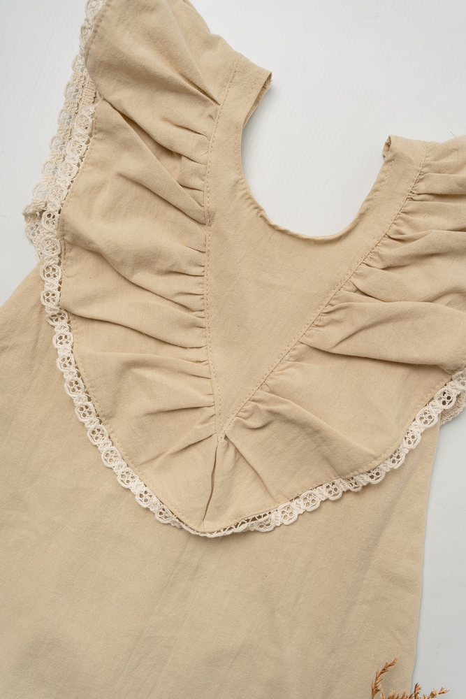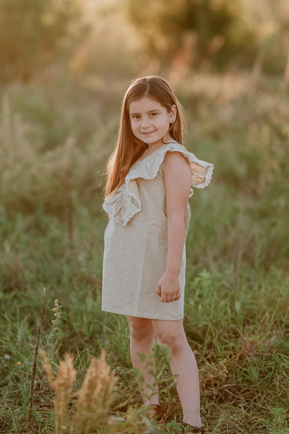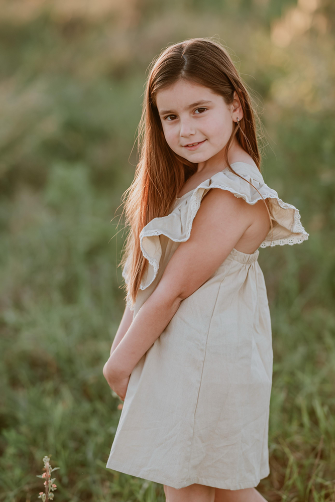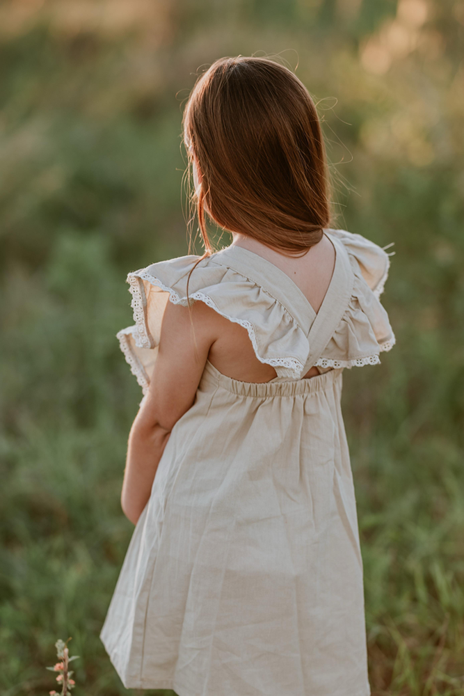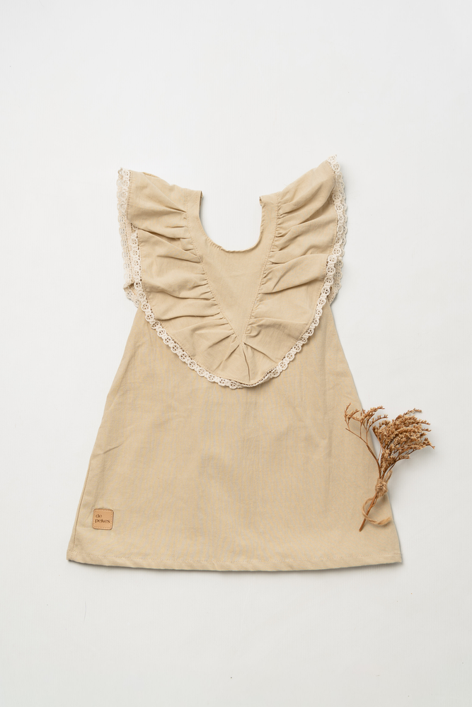🧵 Composición: tusor liviano 100% algodón. 📏 Talles: del 2 al 12 (kids). 📐 Detalle: volado en V en el delantero y espalda cruzada