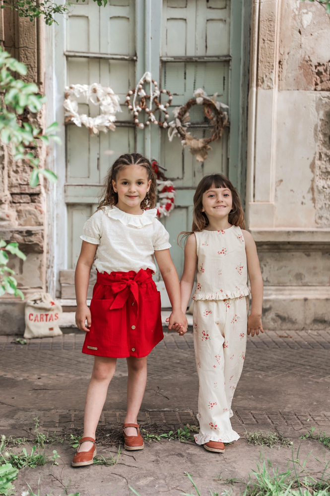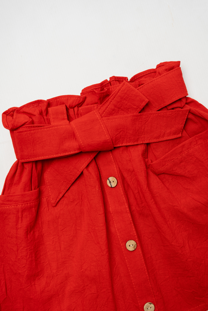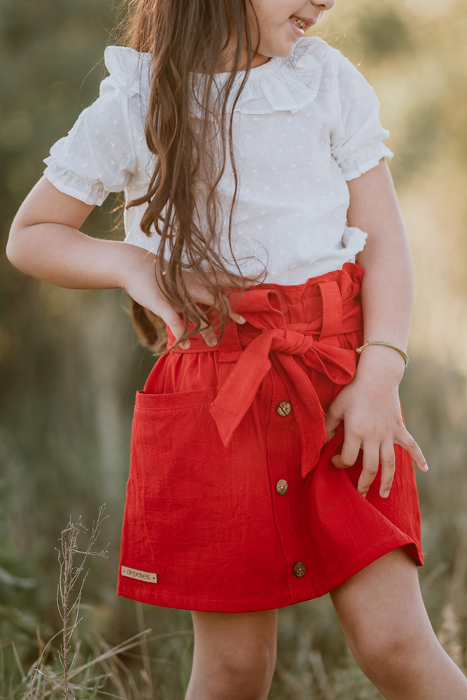 Tela: Tusor liviano 100% algodón. Color: Rojo intenso. Diseño: Cintura alta con lazo, botones delanteros decorativos y bolsillos amplios al frente. Confección: Terminaciones prolijas, costuras reforzadas y calce cómodo. Talles disponibles: del 2 al 12. Hecho en Argentina.