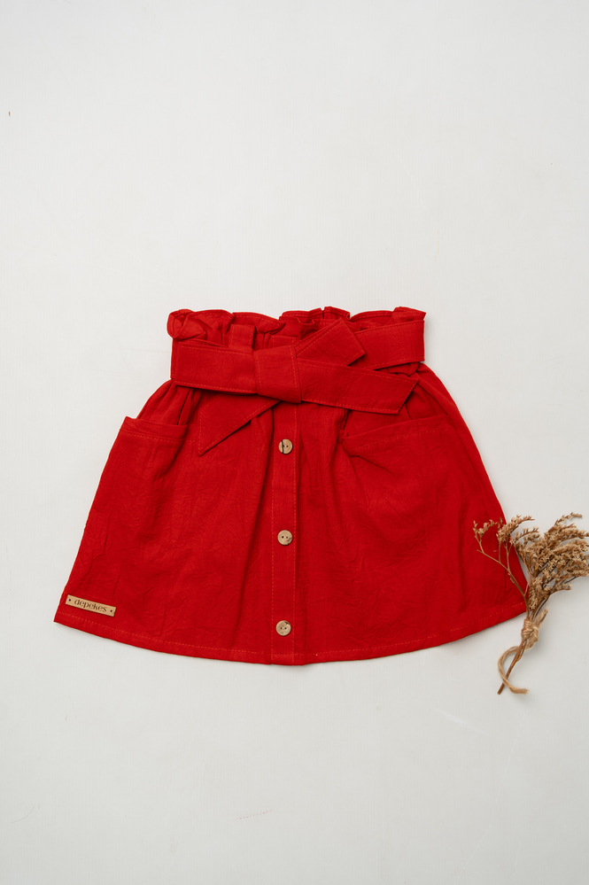 pollera roja con lazo en cintura y bolsillos delanteros.
