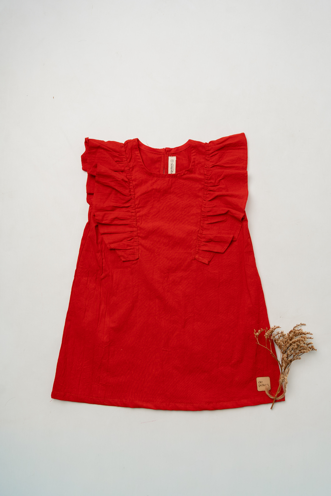 Vestido rojo con volados laterales.