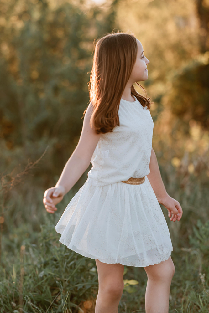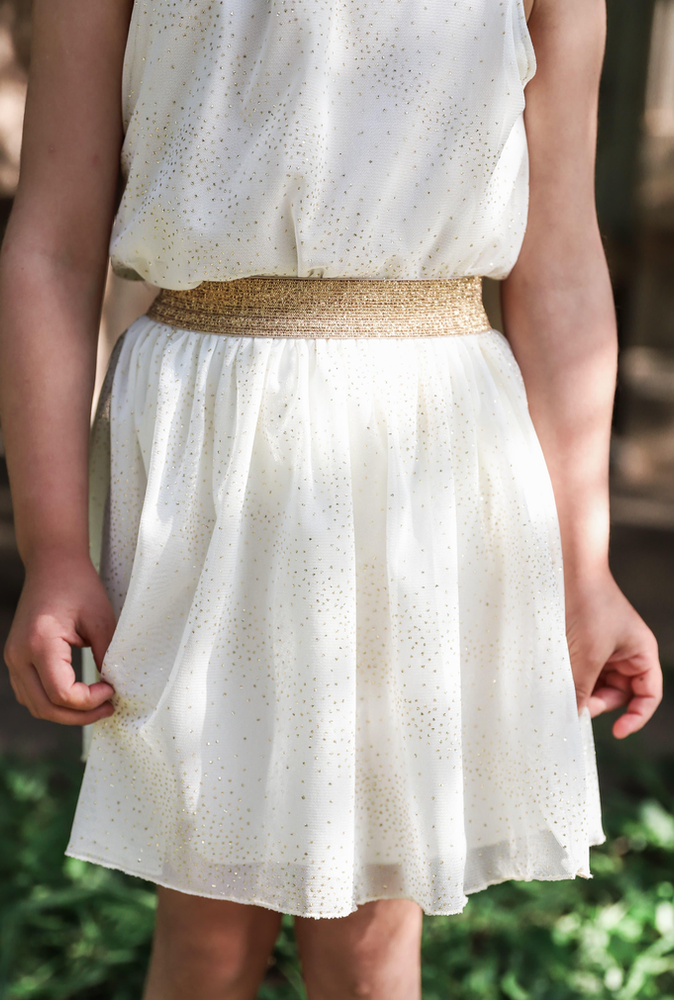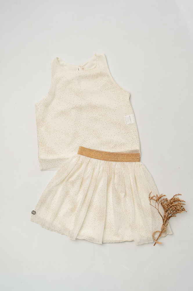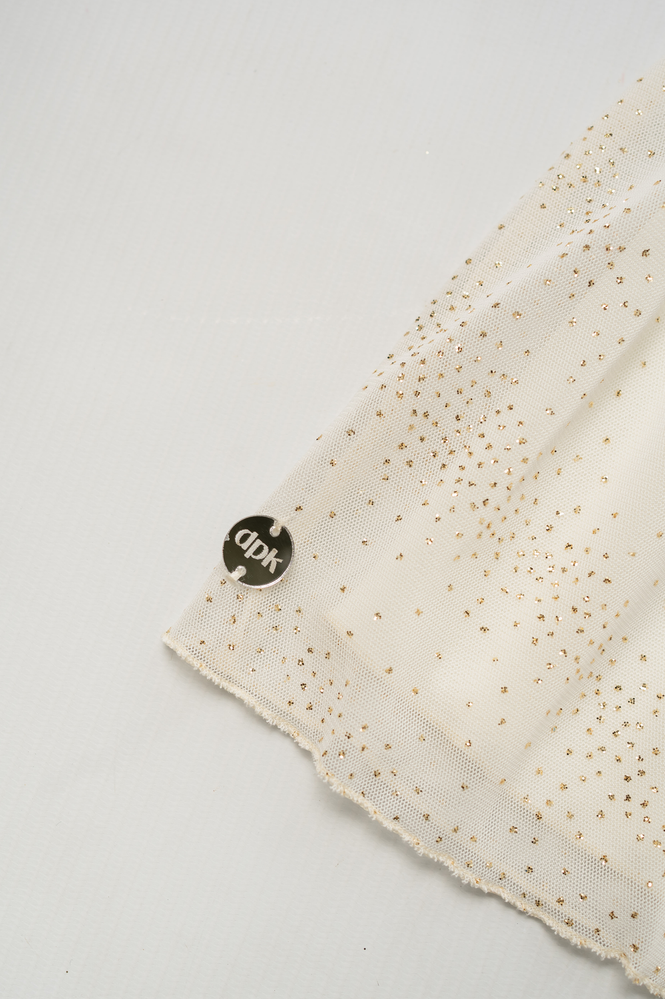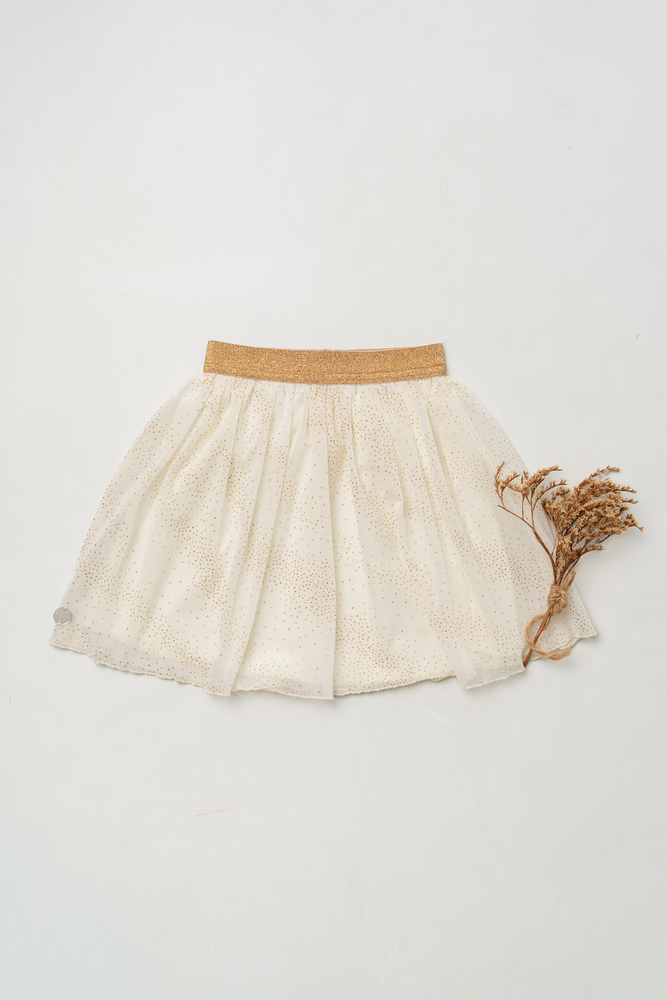 Pollera de tul crudo con detalles de brillo dorados, con cintura elastizada a tono.