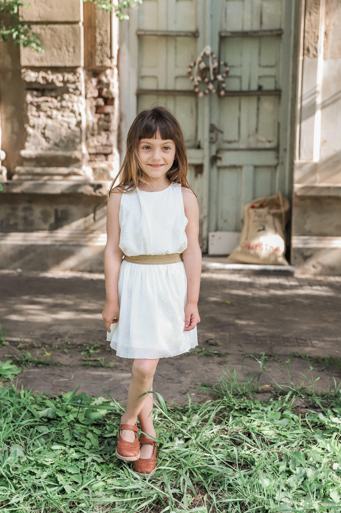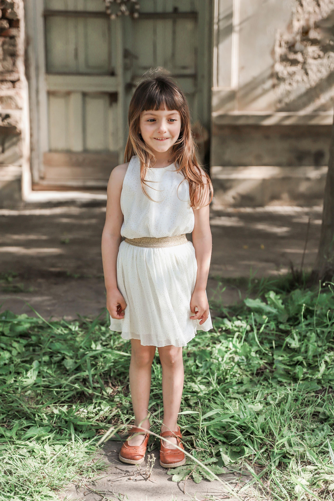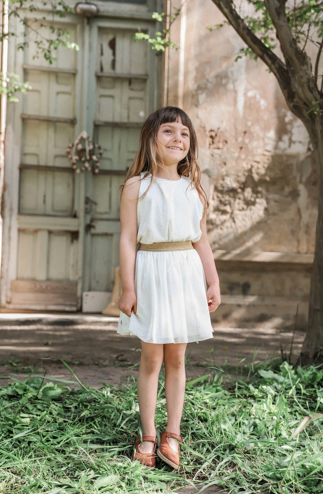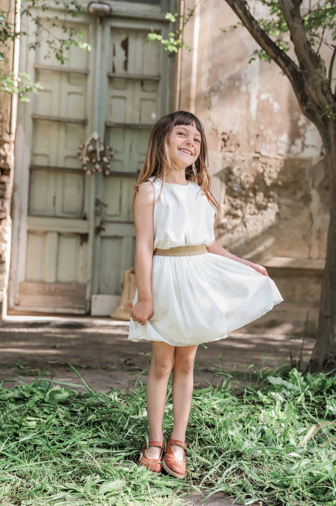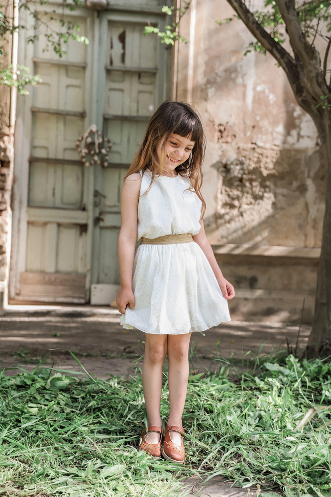 Pollera de tul crudo con detalles de brillo dorados, con cintura elastizada a tono.