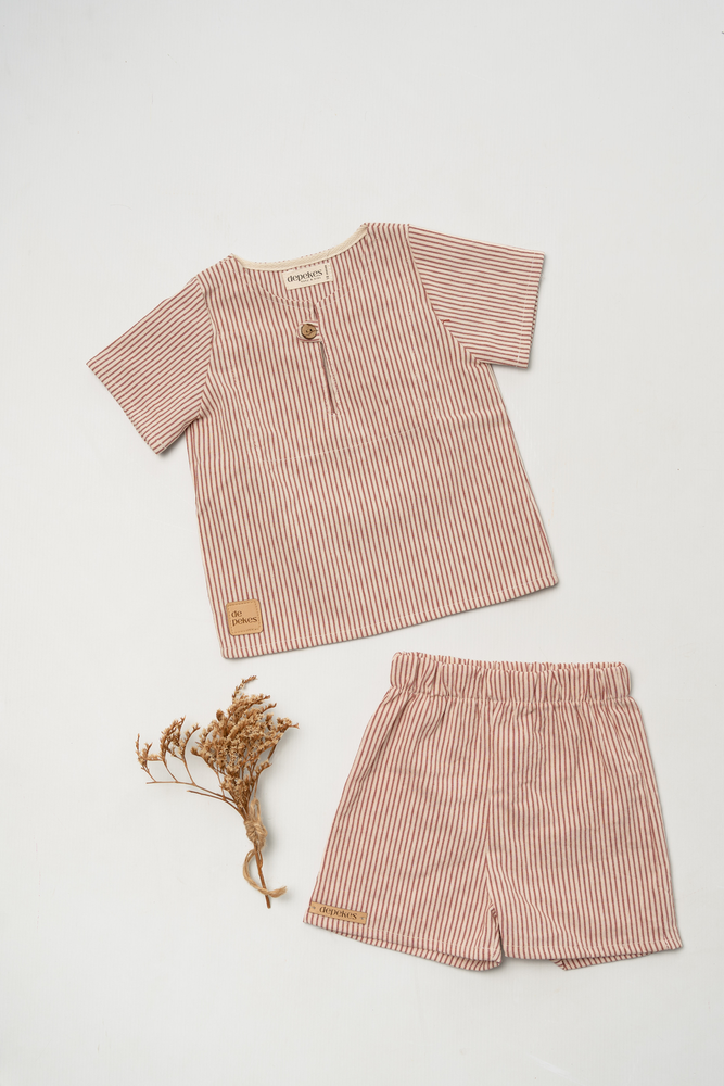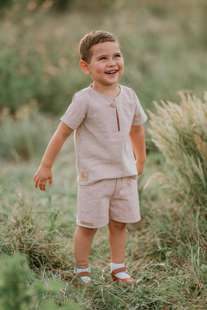 ✨ Camisa Paul Inspirada en los días de sol y juego ☀️, la camisa Paul combina comodidad y estilo con un aire relajado. Su diseño con rayas finas y tonos cálidos la convierte en una prenda versátil y atemporal, perfecta para acompañar cada aventura con frescura y encanto. 🌾