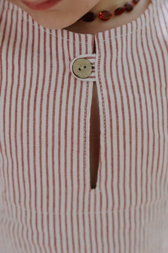 Diseño: corte recto con cuello redondo y escote con tapeta y botón de madera.