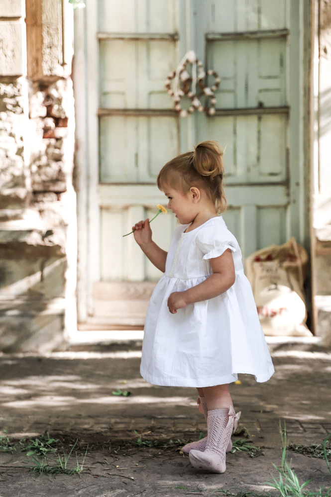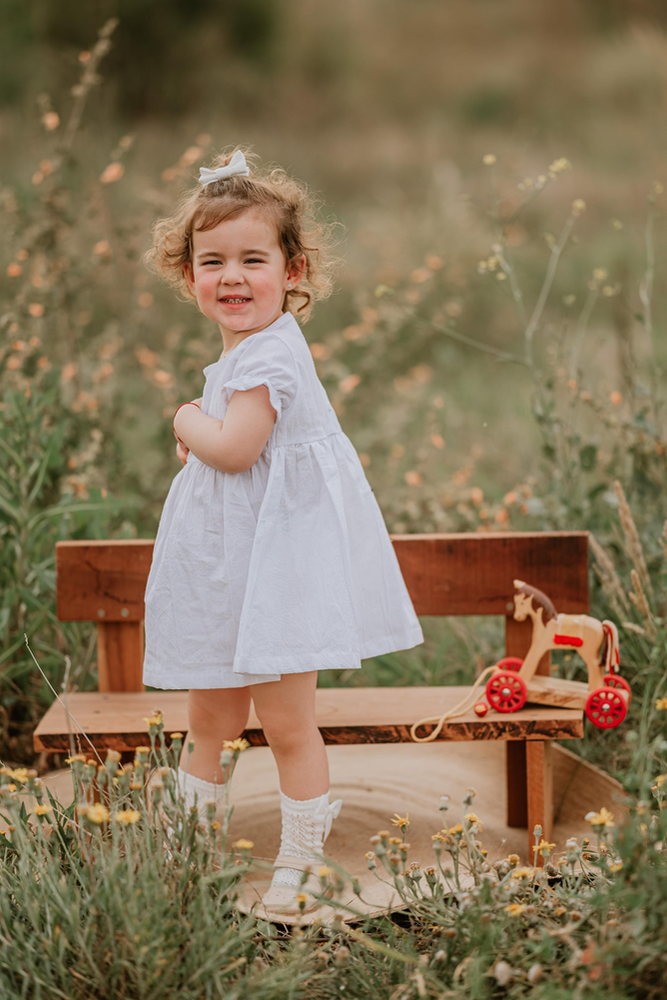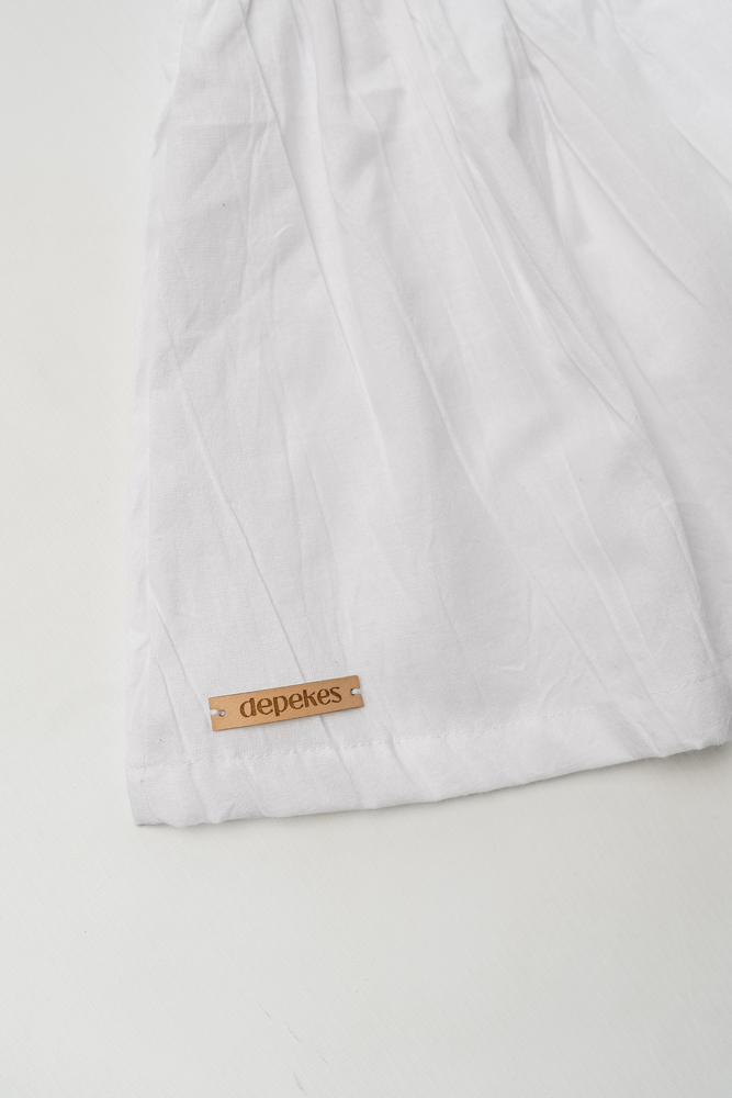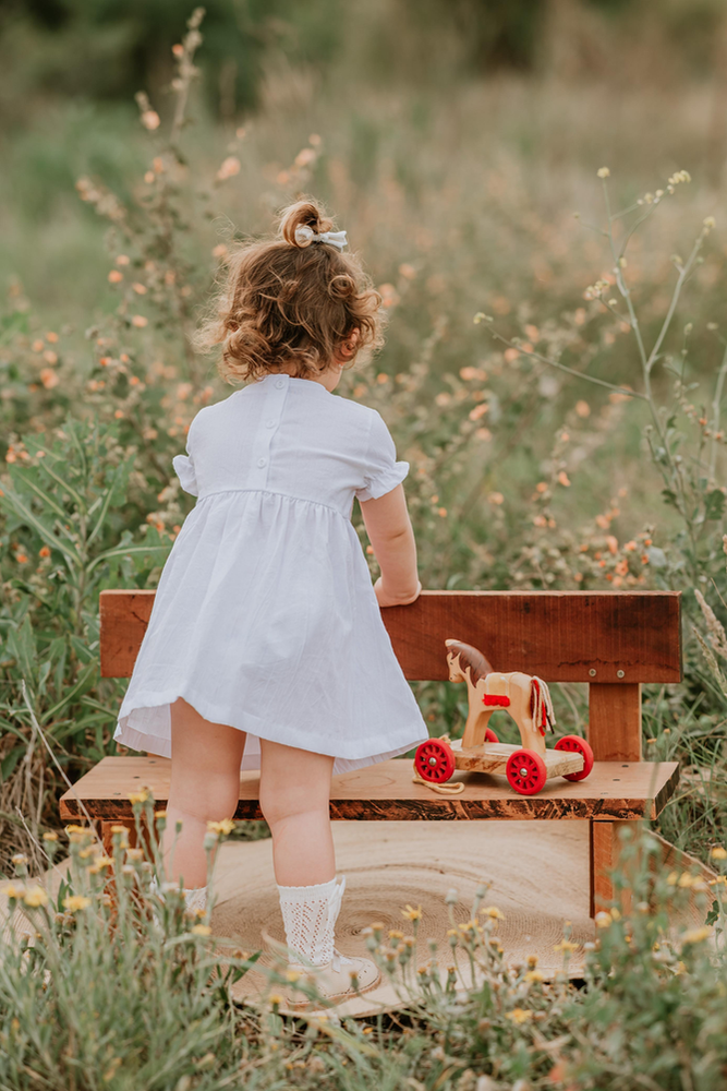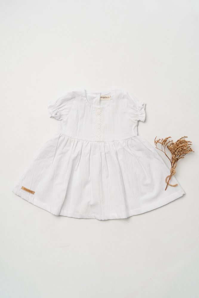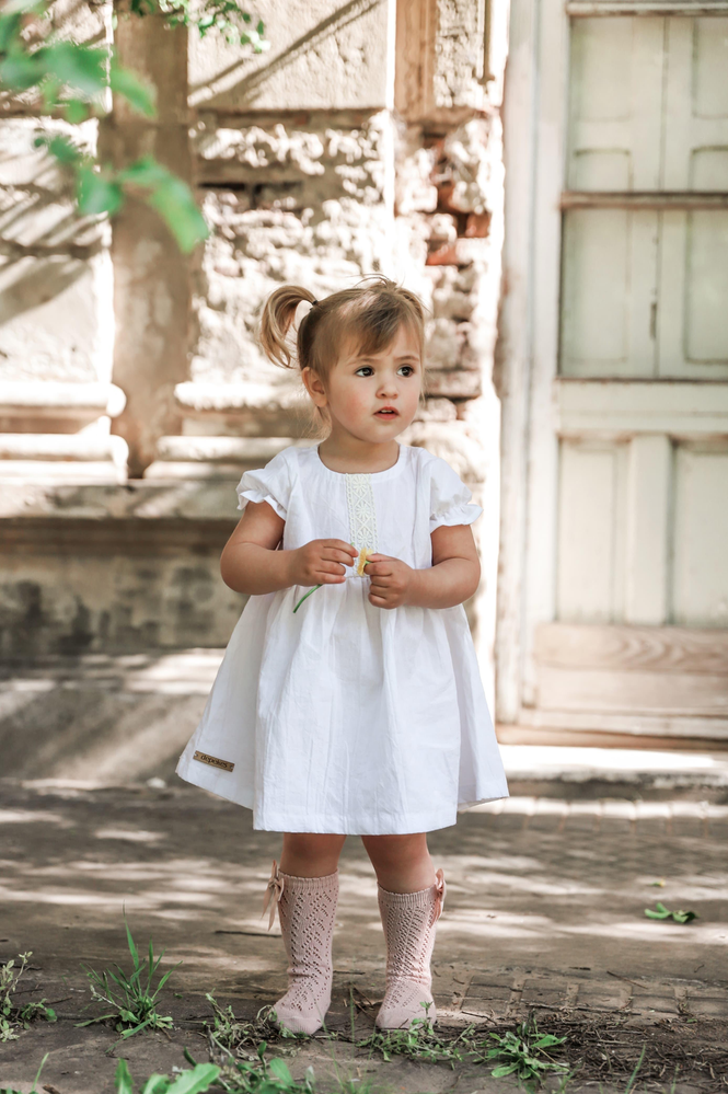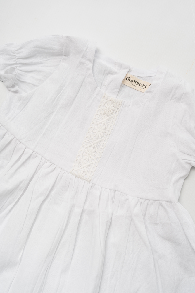 🧵 Ficha técnica: Tela: tusor liviano. color: blanco tiza Detalles: pechara con guipiur frontal delicado, manga corta y falda con leve vuelo. Cierre: botones a tono en la espalda.