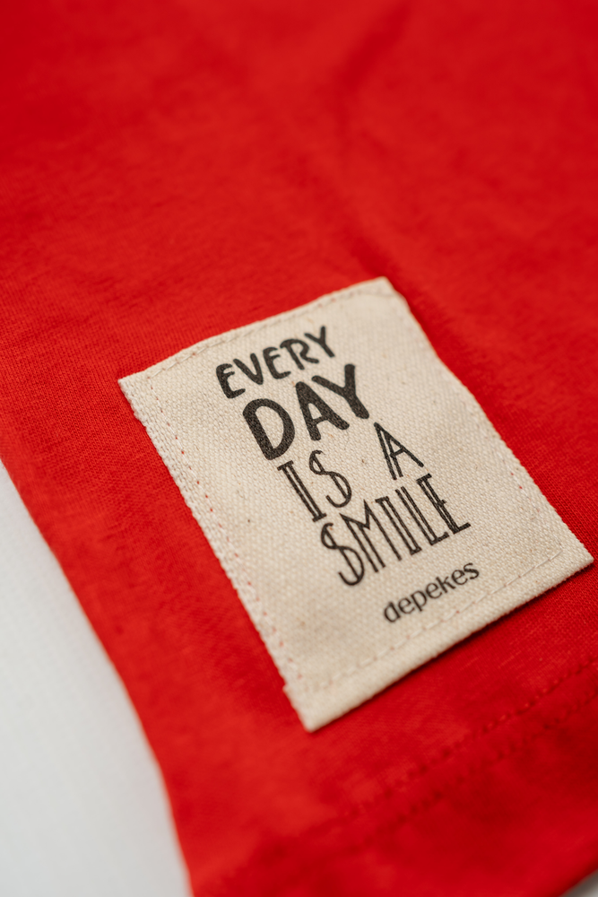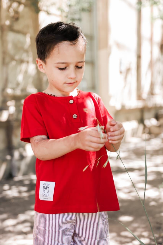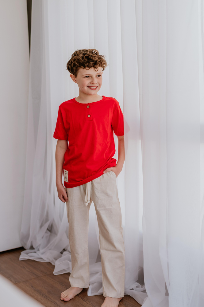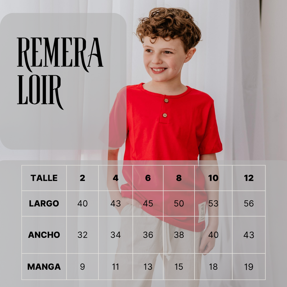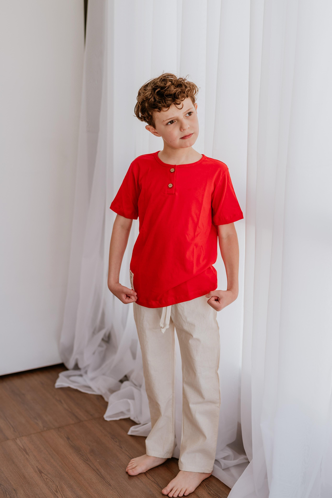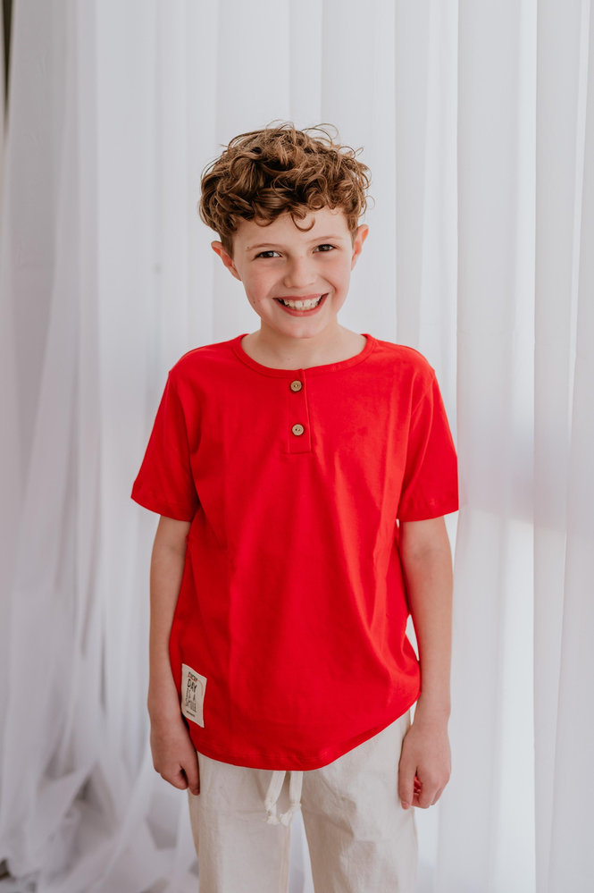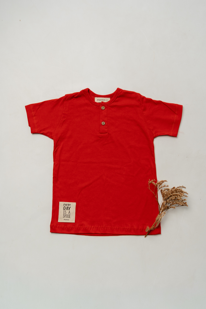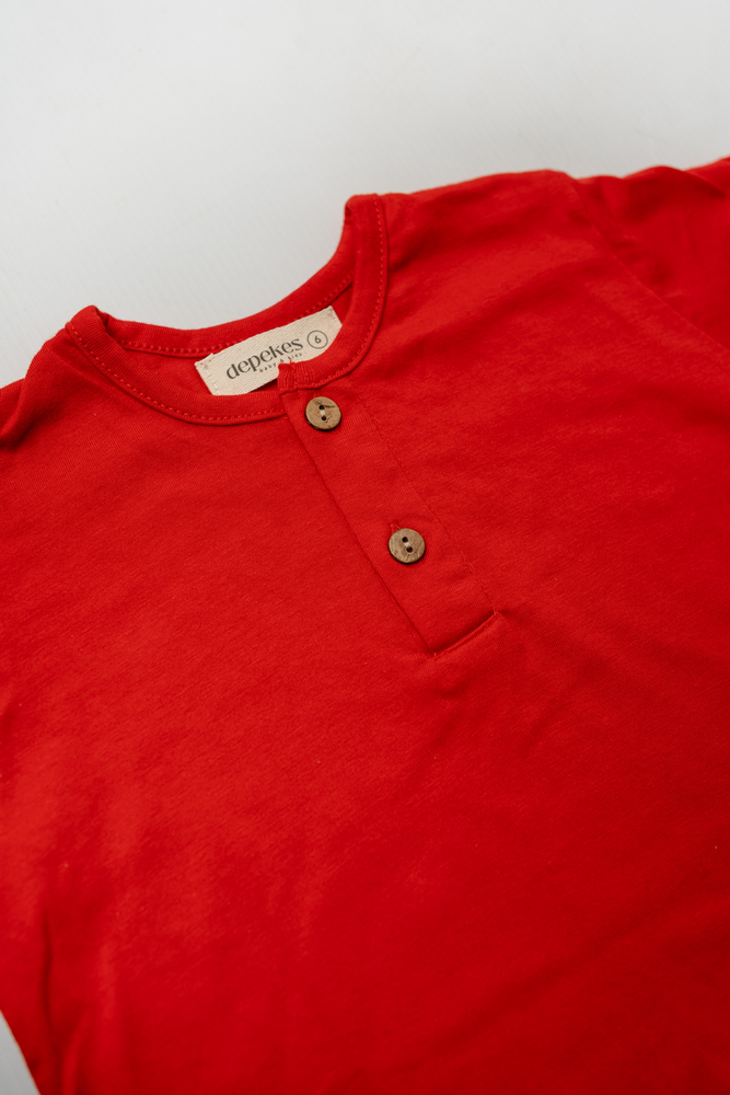 Tela: Algodón 100% (jersey 24/1). Color: Rojo intenso. Diseño: Cuello redondo con dos botones delanteros de madera. Confección: Terminaciones prolijas, costuras reforzadas y calce relajado. Talles disponibles: del 2 al 12. Hecho en Argentina.