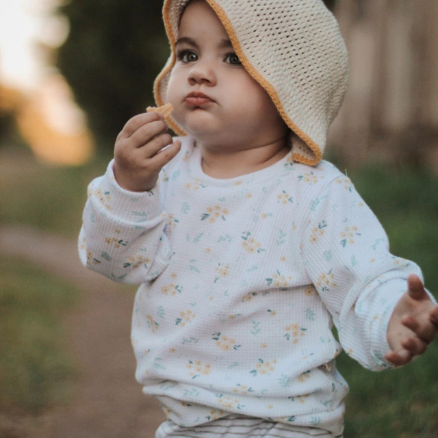 BUZO LIVIANO CON DELICADA ESTAMPA DE FLORES EN TONOS MAIZ