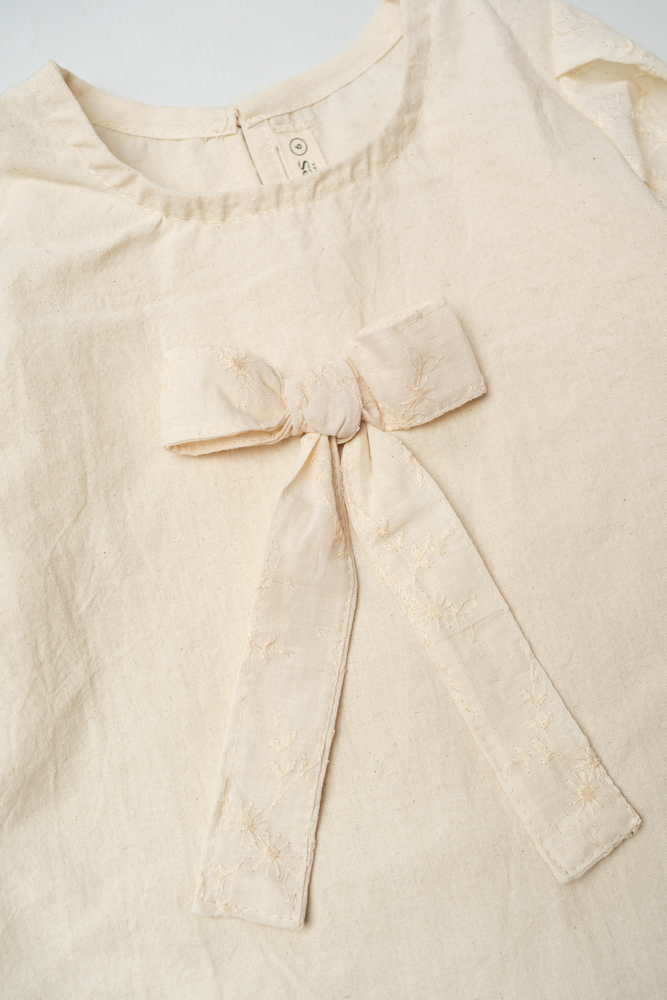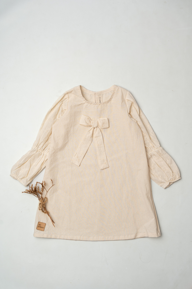 Su diseño minimalista se realza con mangas de broderie que aportan textura y un detalle romántico sutil. El lazo frontal suma encanto y delicadeza, logrando un look limpio, clásico y súper combinable.