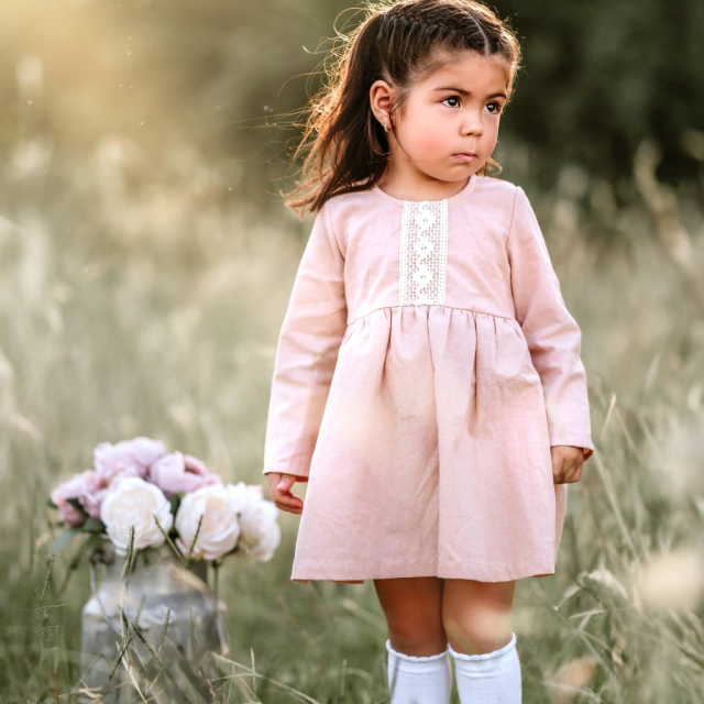 Vestido rosa con guipiur en el delantero.