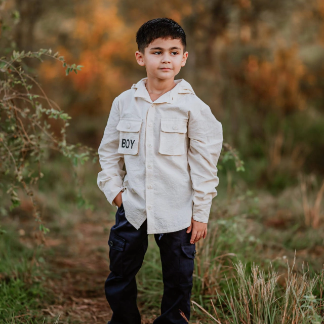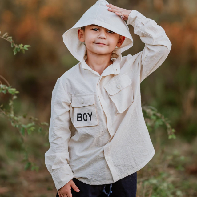 Confeccionada en tusor liviano con detalle de estampado BOY en bolsillo delantero.- Bolsillos con fuelle y capucha.