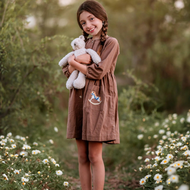 vestido camisero chocolate, con delicado bordador en bolsillo delantero.