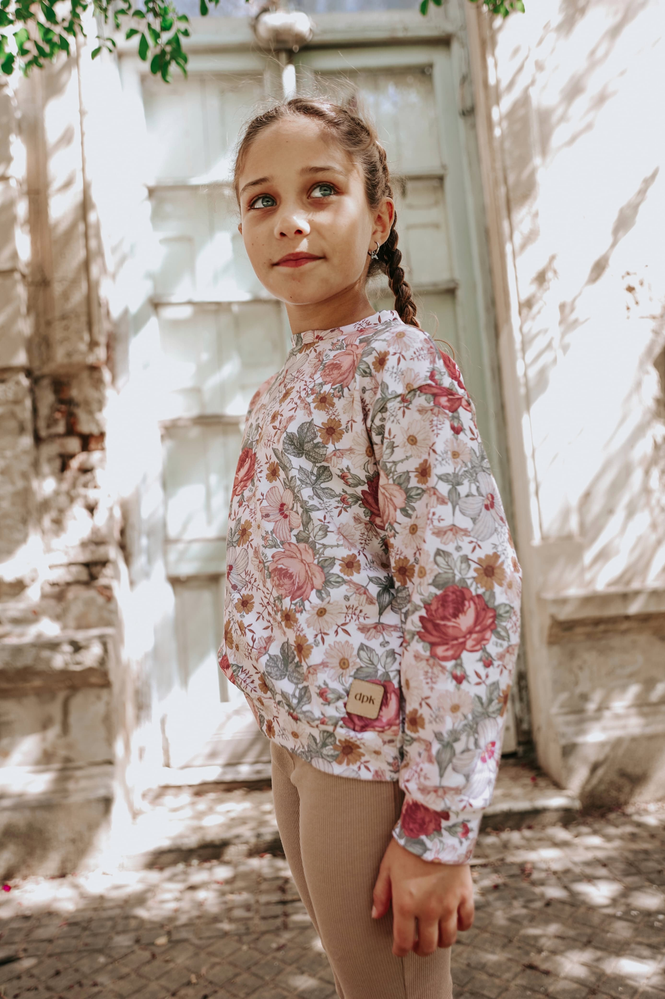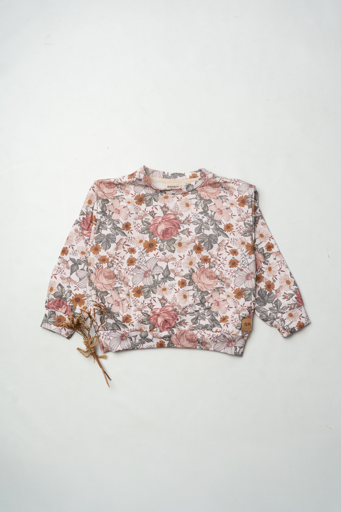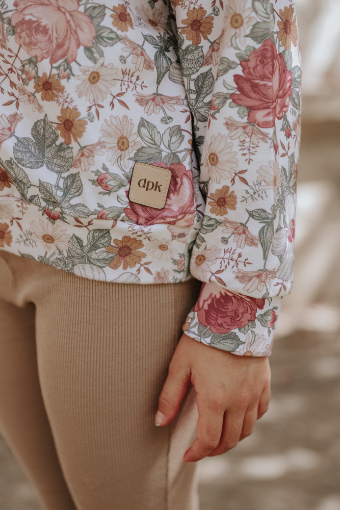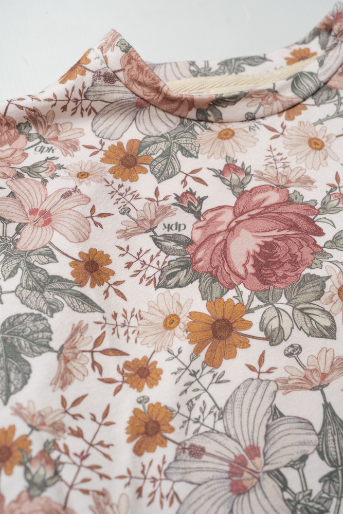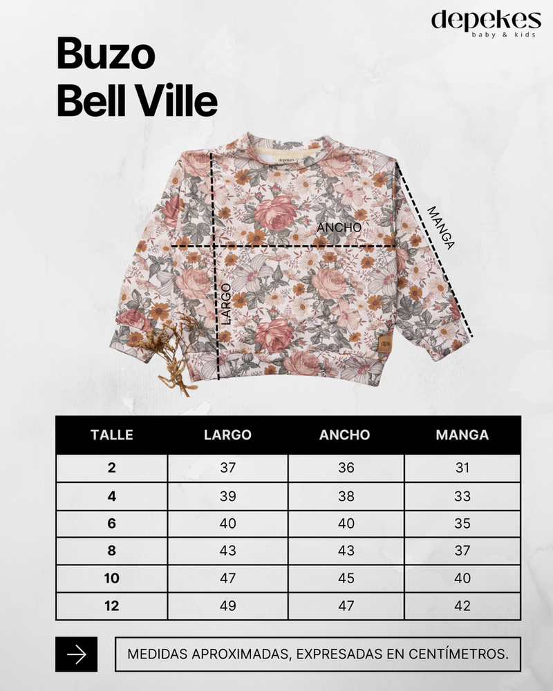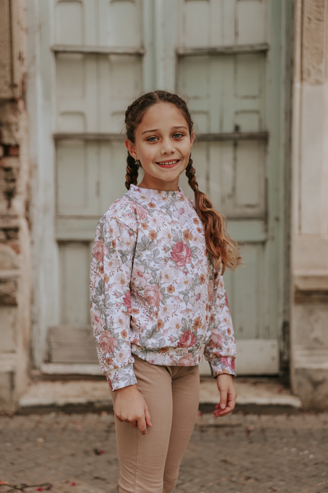 El Buzo Bell Ville está confeccionado en algodón rústico, ideal para abrigar con suavidad durante los días frescos. Su estampa floral de inspiración vintage, en tonos suaves y delicados, aporta un look romántico y atemporal 🌷
