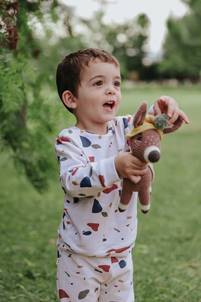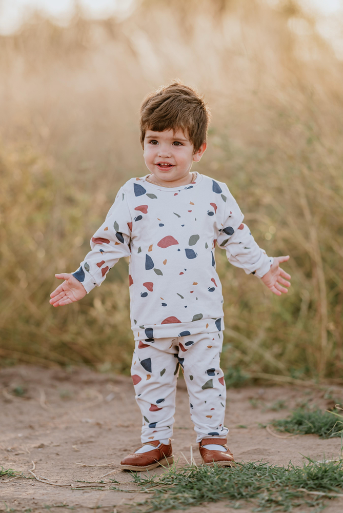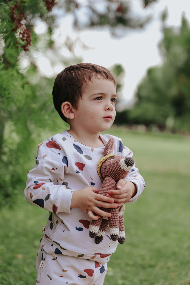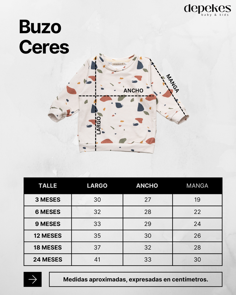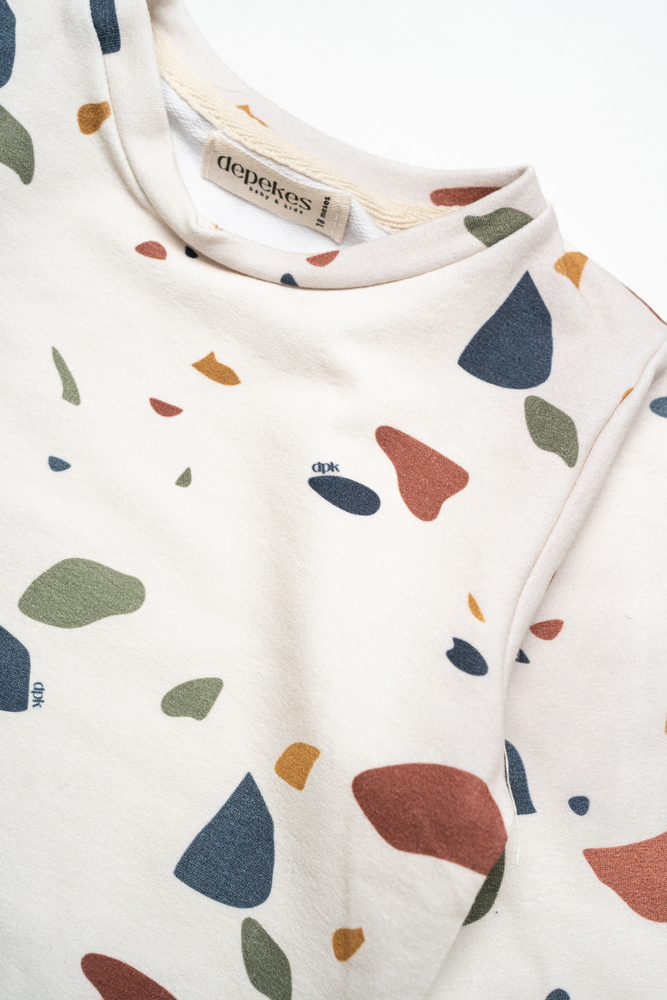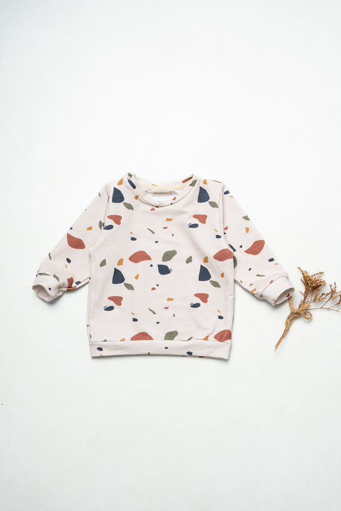 El Buzo Ceres está confeccionado en algodón rústico estampado, ideal para abrigar sin perder comodidad. Su estampa orgánica, con formas y colores suaves, aporta un look moderno y delicado, perfecto para los peques 🌿