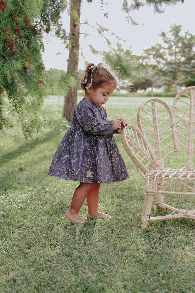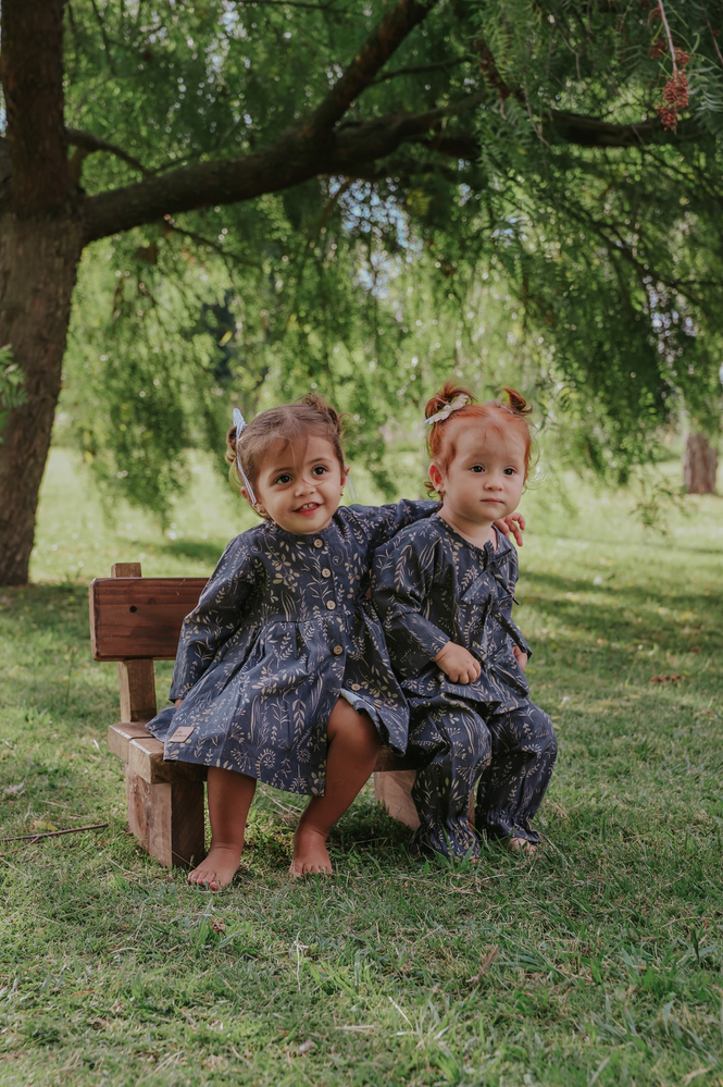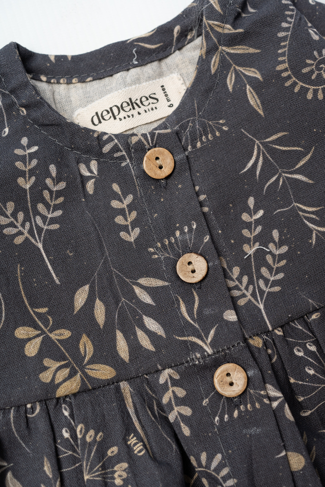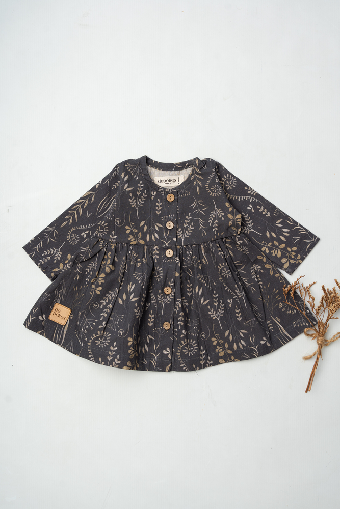 Su estampa de inspiración natural, en tonos cálidos sobre fondo oscuro, crea un contraste delicado y muy original. El corte amplio con frunce en la cintura aporta volumen y movimiento, logrando una silueta suelta y encantadora. Los botones delanteros suman un detalle clásico y funcional que completa el diseño.