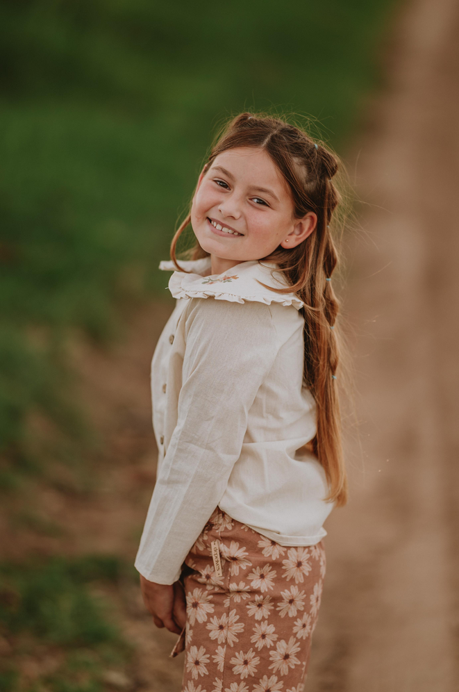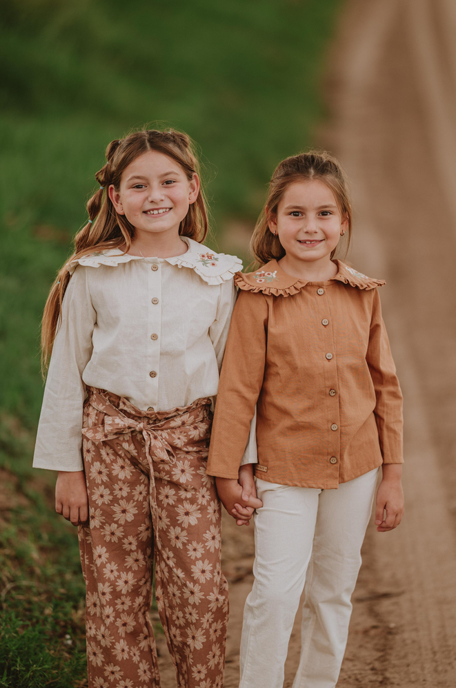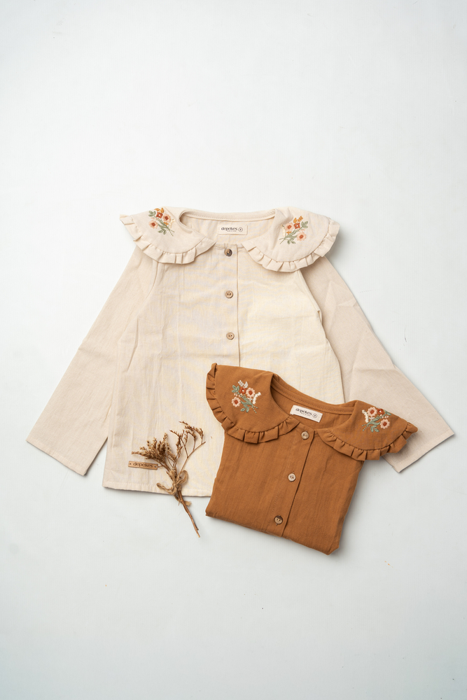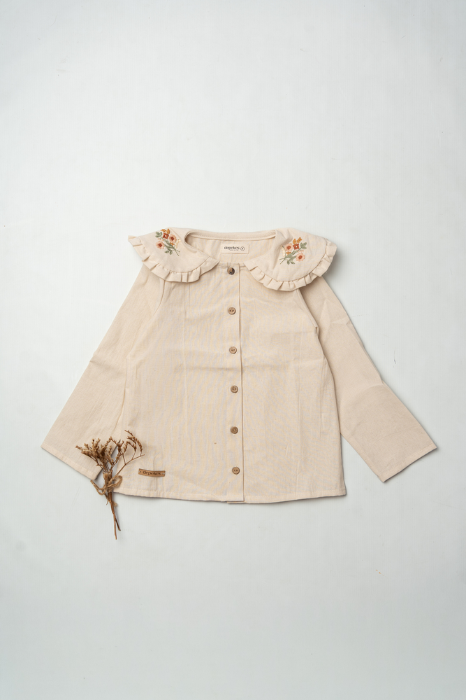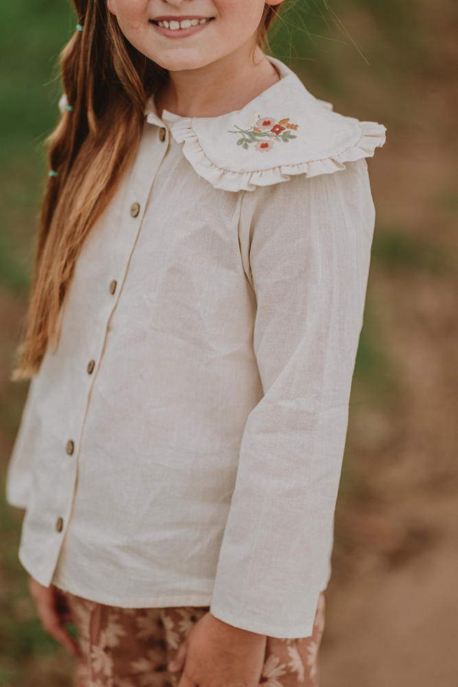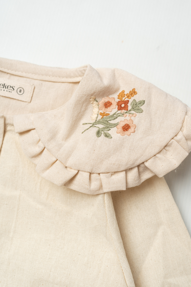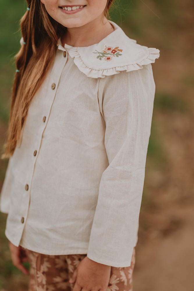 Su gran protagonista es el cuello amplio con volado, que enmarca la parte superior con un estilo romántico y atemporal. Los bordados florales sobre el cuello suman un toque artesanal y cálido, que transforma una prenda simple en algo especial. El frente abotonado aporta practicidad y un acabado clásico.