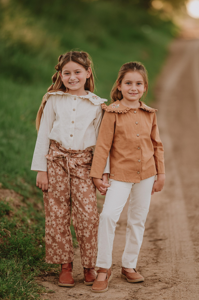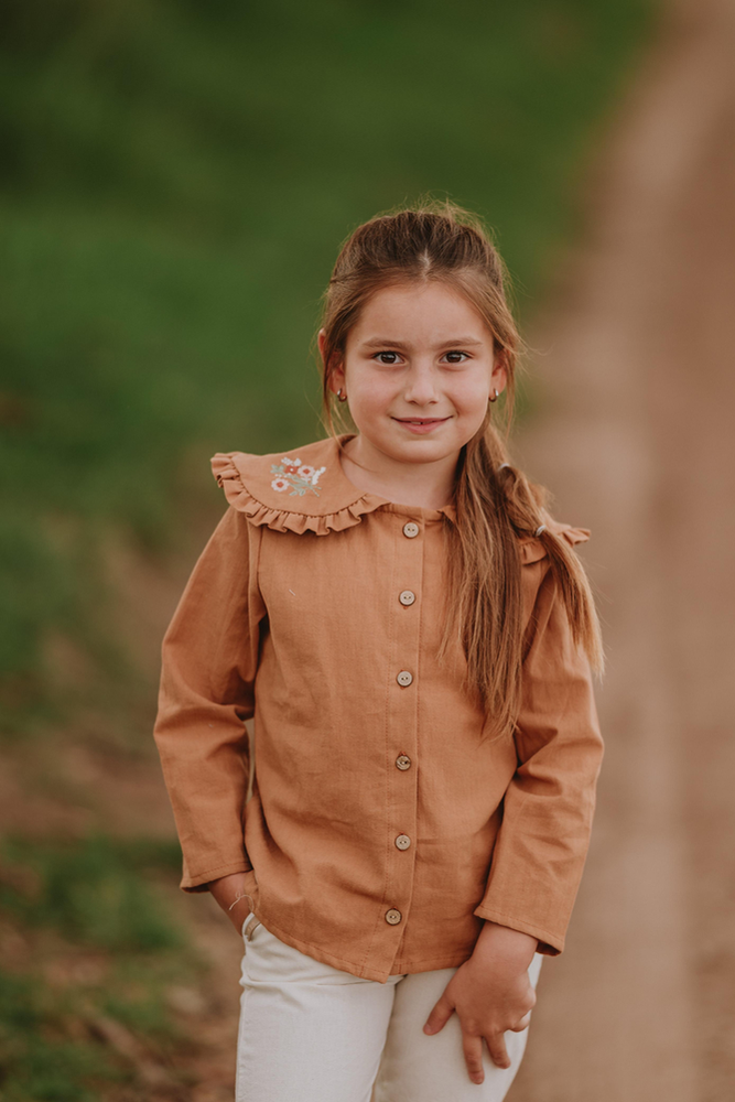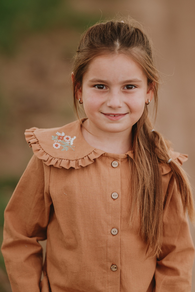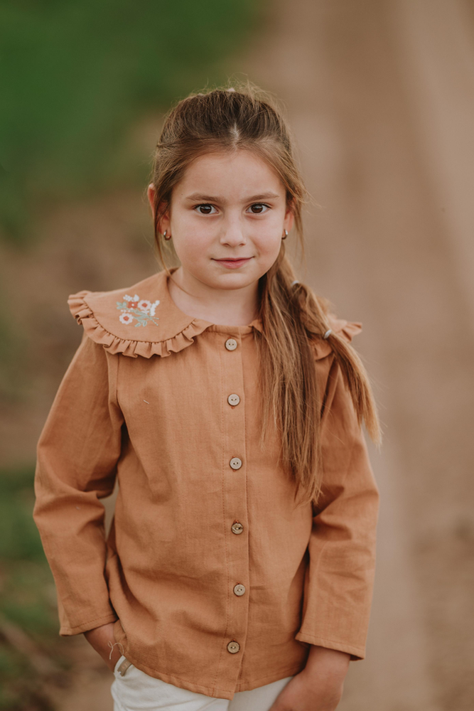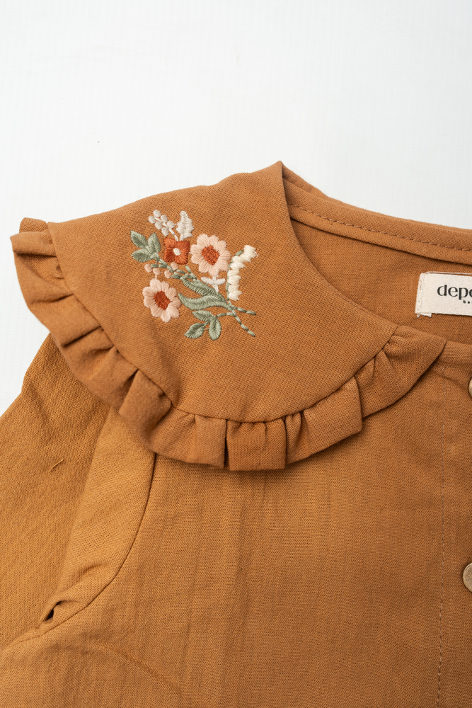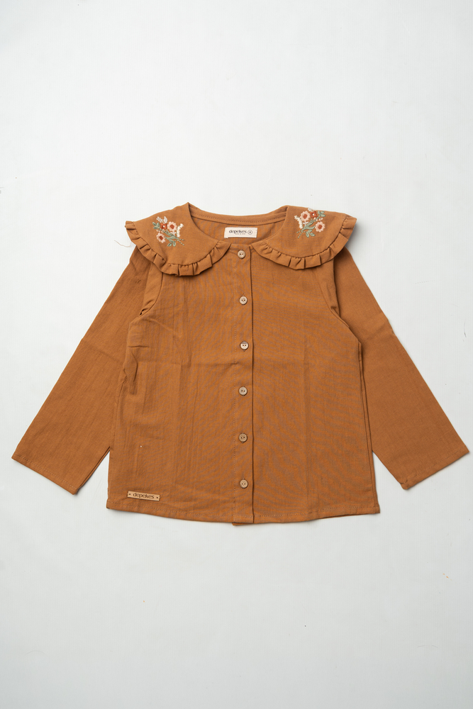Camisa con cartera delantera, cuello baby bordado.- Color canela