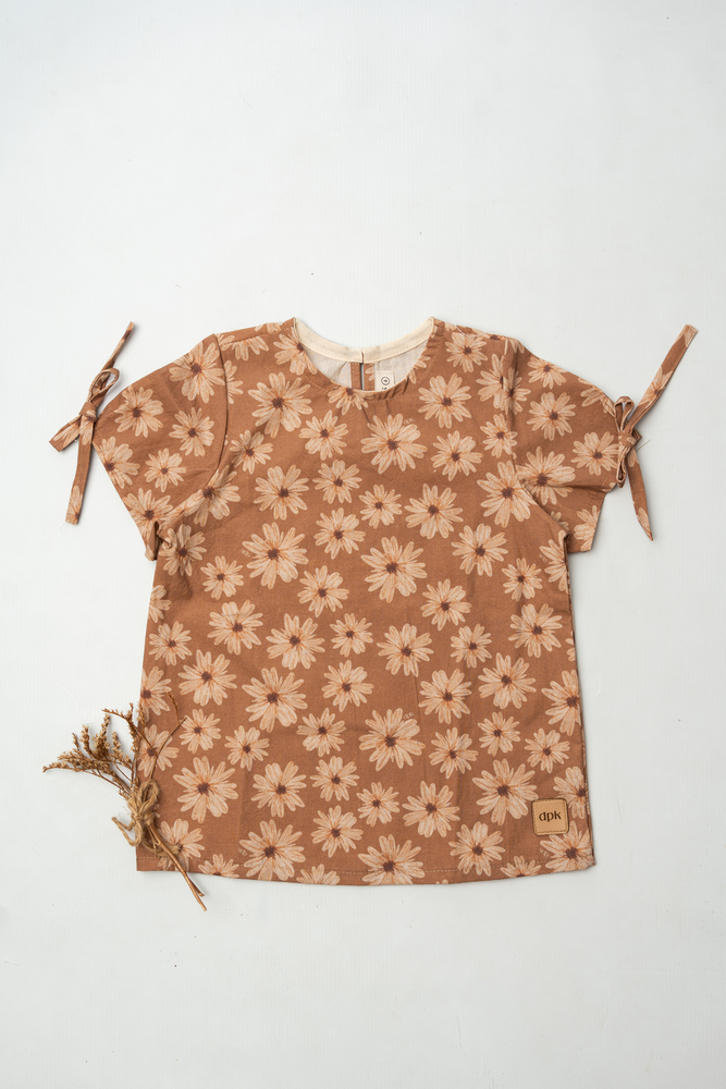Blusa Manga Corta, detalle de lazo aplicado en manga. Tusor prelavado estampadpoo.-