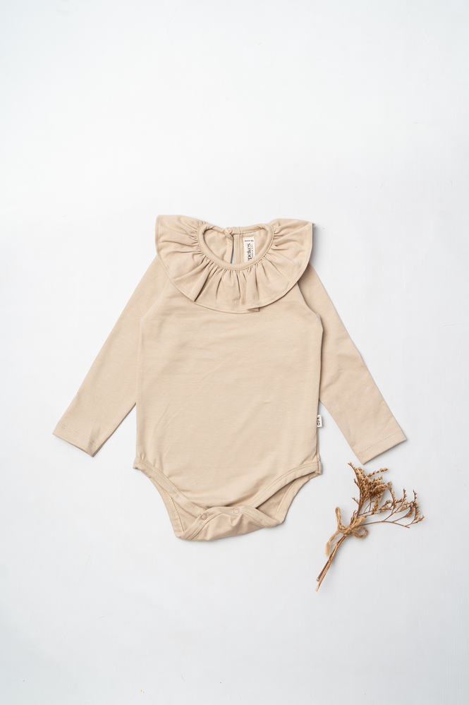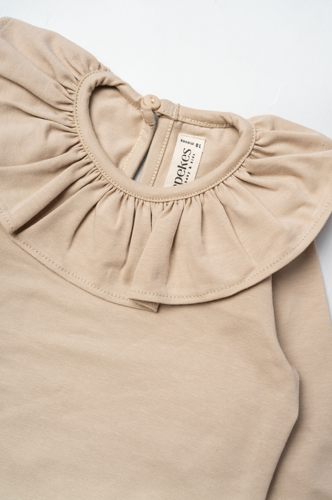 El gran protagonista es su cuello con volado amplio y fruncido, que enmarca la carita y aporta un detalle romántico y delicado, ideal para looks más armados o para levantar un conjunto simple. Las mangas largas lo hacen versátil para días frescos, manteniendo al bebé abrigado pero cómodo.