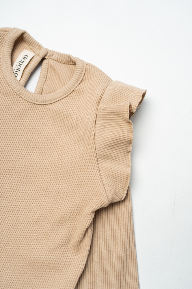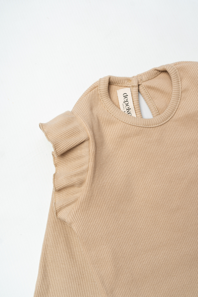 El detalle protagonista está en los volados en los hombros, que le dan un aire romántico y delicado, sumando estilo a un básico de todos los días. Es de esas prendas que levantan cualquier conjunto sin esfuerzo, perfecta para usar sola o acompañada de ranitas, bombachudos o jardineros.