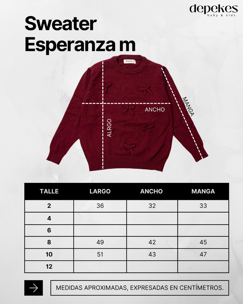El Sweater Esperanza celebra la dulzura de la infancia con un diseño delicado y lleno de encanto 🤍. Sus pequeños lazos aplicados aportan un detalle romántico que lo convierte en una prenda especial, ideal para looks cálidos y cuidados.