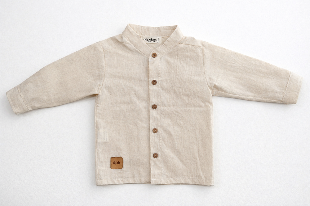 Confeccionada en tusor liviano, cartera delantera. Cuello mao. Color crudo lavadoo