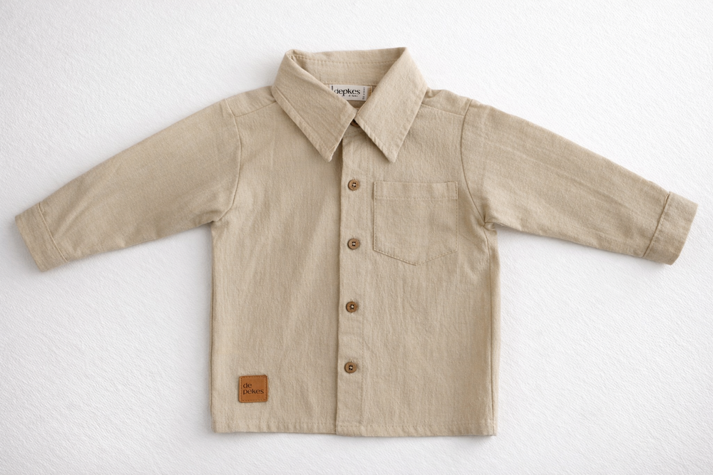 Confeccionada en tusor, Cuello aplicado y cartera delantera. color arenaa